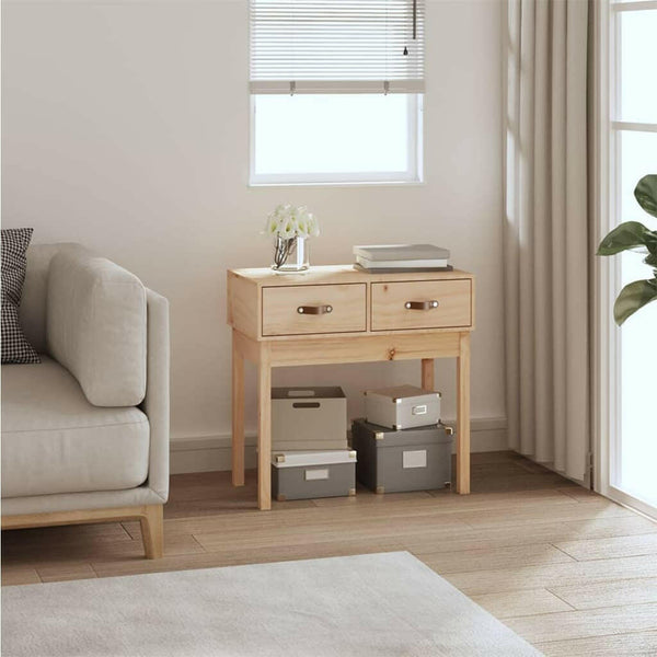Deze stijlvolle wandtafel is vervaardigd uit massief grenenhout, een prachtig en natuurlijk materiaal dat garant staat voor duurzaamheid en robuustheid. De kenmerkende rechte nerven en noesten geven de tafel een rustieke uitstraling die in elke inrichting tot zijn recht komt. Met afmetingen van 76,5 x 40 x 75 cm (B x D x H) is deze tafel ontworpen om voldoende opbergruimte te bieden met twee handige lades. Hiermee houdt u al uw dagelijkse benodigdheden netjes geordend en binnen handbereik.