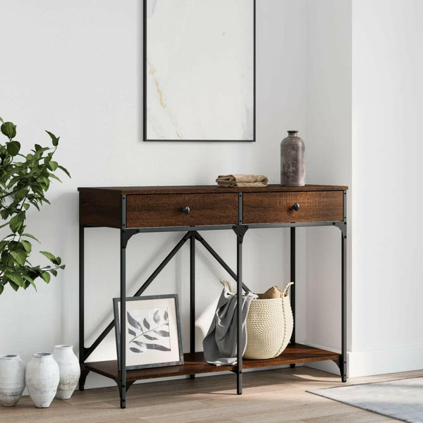 De wandtafel is vervaardigd uit bewerkt hout van hoge kwaliteit, dat niet alleen sterk en stabiel is, maar ook vochtbestendig. Het stevige stalen frame garandeert een uitstekende stabiliteit, waardoor je met een gerust hart je decoratieve items kunt plaatsen. Met twee lades en een schap biedt deze praktische tafel voldoende ruimte voor het opbergen van boeken, opbergdozen en andere decoraties. Het tafelblad is perfect om je favoriete fotolijsten of potplanten op te plaatsen, waardoor het een multifunctionele toevoeging aan je interieur wordt. Bovendien zorgen de zes verstelbare poten ervoor dat de tafel op oneffen ondergronden stabiliteit biedt, zodat je altijd je optimale gebruiksgemak hebt.
