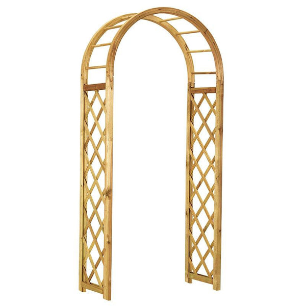 Ontdek de pracht van onze ronde rozenboog, een perfecte aanvulling voor uw tuin. Let op: onze ijzeren paalpunten zijn niet compatibel met deze rozenboog. Vervaardigd uit geïmpregneerd Noord-Europees vuren hout, biedt deze boog met een doorgangsbreedte van 120 cm, een hoogte van 298 cm en een diepte van 45 cm een elegante en functionele toevoeging aan uw buitenruimte.
