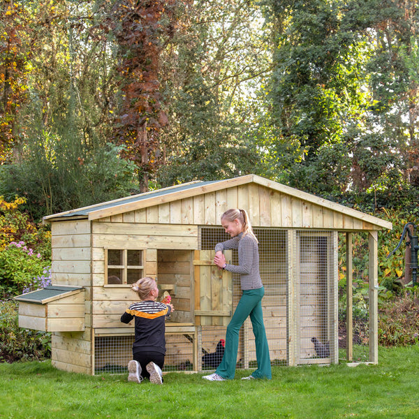 - Duurzaam en Weerbestendig: Het kippenverblijf is gemaakt van hoogwaardig vurenhout, dat geïmpregneerd is voor extra duurzaamheid en bescherming tegen weersinvloeden.