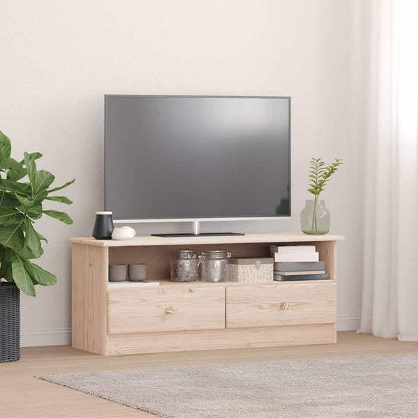 Aus massivem Kiefernholz gefertigt, garantieren diese Möbel Langlebigkeit und eine stabile Konstruktion. Das Design umfasst zwei geräumige Schubladen und ein offenes Fach, in dem Sie problemlos Zeitschriften, Bücher und DVDs aufbewahren können. Die praktischen Holzknöpfe erleichtern das Öffnen und Schließen der Schubladen und verleihen dem Ganzen gleichzeitig einen zusätzlichen Charme. Darüber hinaus ist der Medienschrank leicht zu warten; Sie können es leicht mit einem feuchten Tuch reinigen und es erfordert nur minimale Wartung. Die unbehandelte Oberfläche bietet Ihnen die Möglichkeit, das natürliche Aussehen beizubehalten oder die Möbel nach Wunsch zu streichen oder zu lackieren. Das Möbel hat die Maße 100 x 35 x 41 cm (B x T x H), mit detaillierteren Platzverhältnissen wie den Außenmaßen der Schubladen von 47 x 16 cm (L x B) und den Innenmaßen von 42,5 x 30 x 12 cm (B x T x H) und ist somit perfekt auf Ihre Bedürfnisse zugeschnitten.