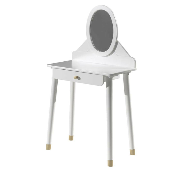 La coiffeuse offre un tiroir généreux pour ranger en toute sécurité tous les précieux accessoires de votre enfant. Les pieds hauts avec une élégante finition dorée sont frappants, à côté du miroir rond magnifiquement fini. La combinaison du bois de pin massif robuste et du MDF laqué assure à la fois durabilité et look contemporain. Cette coiffeuse pour enfants peut facilement être combinée avec d'autres éléments de la série de meubles Billy de Vipack, rendant l'ameublement de la chambre des enfants homogène.